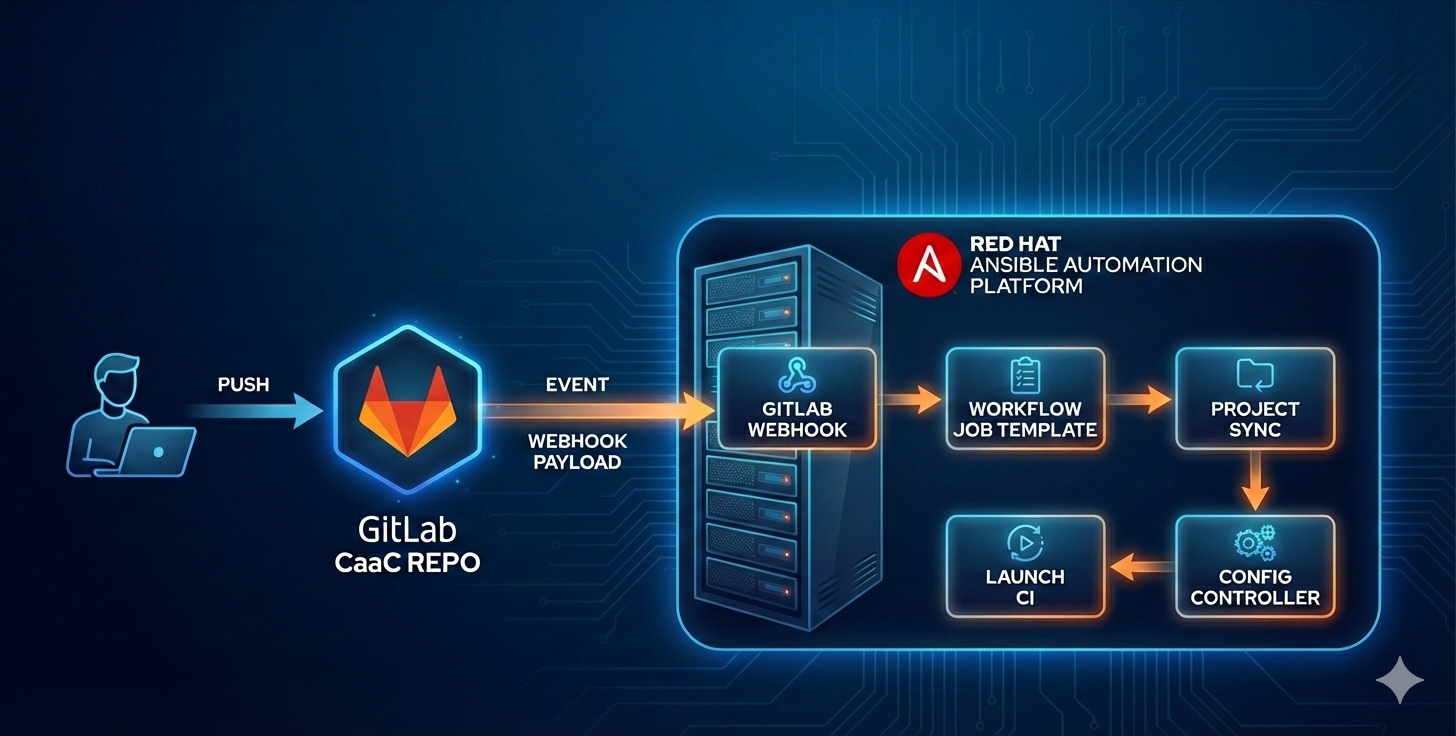- After approval via a merge request, a webhook triggers synchronization with AAP controllers.
