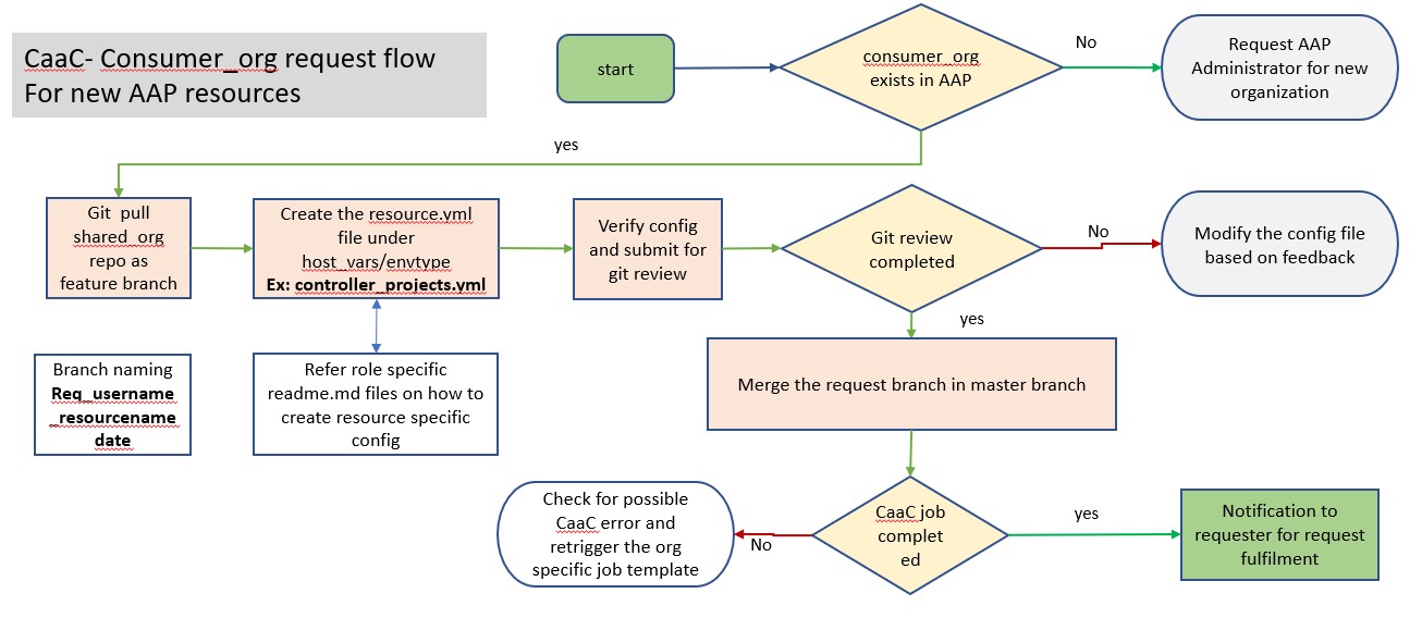 The Consumer repository abstracts the Provider repository, hosting only organization-specific variables and requirements. This ensures that Consumer organizations can request AAP resources without impacting the core functionality.