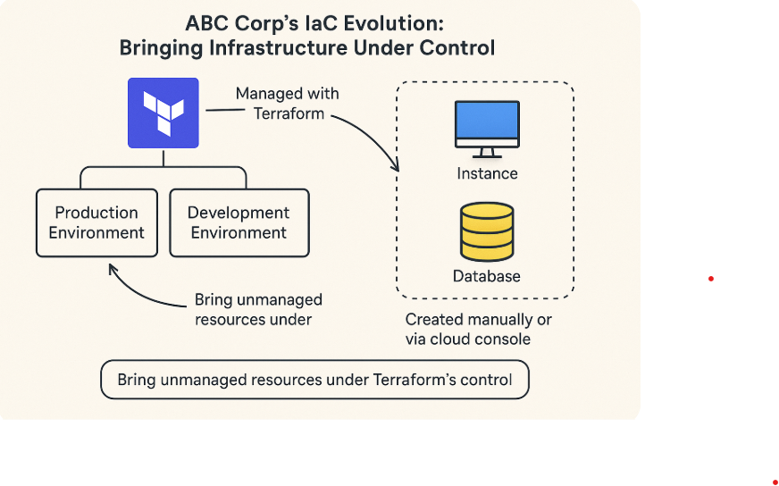 ABC Corp has multiple environments (production and development), and their infrastructure is managed using Terraform. However, during their ongoing migration from on-premises systems to the cloud, certain resources were created manually or via the cloud console, outside of Terraform’s management. This creates the need to bring those resources under Terraform’s control to ensure they are properly managed going forward.
